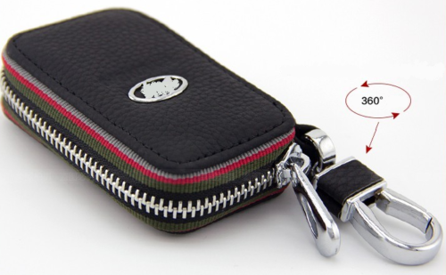 Smart nyckelring med plånbok i svart äkta läder och med dragkedja för förvaring av mindre saker, i en snygg design med BMW-logotyp.