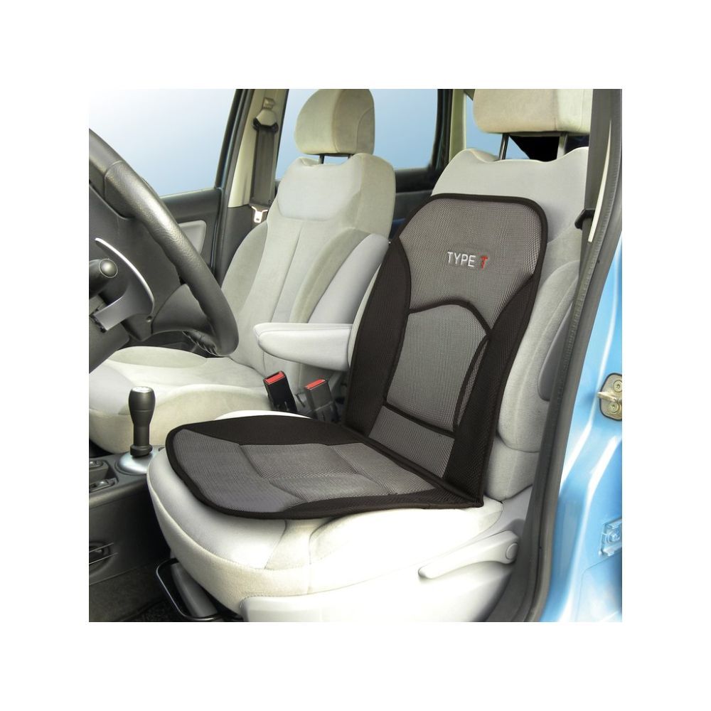 Universellt komfort/stöd säte i snygg sportig design. Fästs enkelt på bilens säte med hjälp av elastiska remmar med krokar. Du kan nu sitta bekvämt i ditt säte, kan användas både fram och bak, monteras dock inte lika bra bak. Sätet har en lång inbyggd kudde som stödjer din rygg under körning. Sätet är tillverkat i svart och grått, så det passar in i de flesta bilar. Typ-T är broderat i tyget högst upp på ryggen.